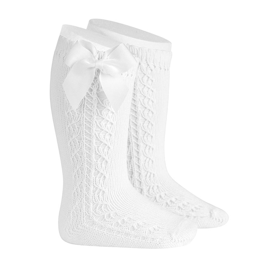 Mitjons de cotó llargs per sota del genoll i punt llis. Detall de llaços de gros-grain a to al costat.Disponible en talles de 0-3 mesos a 10 anys.