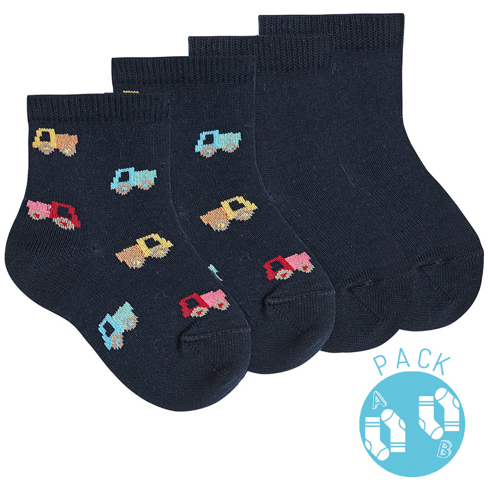 Pack de dos parells de mitjons: un parell de mitjons amb dibuixos de camions i un altre parell de mitjons llisos.