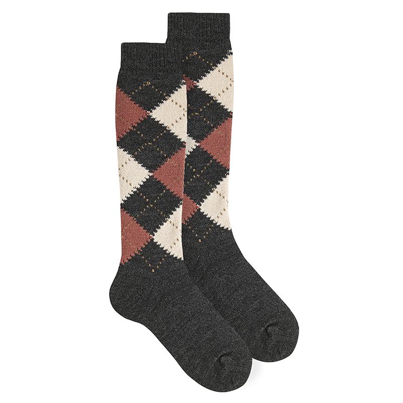 Mitjons alts acrílics clàssics de rombes intarsia en colors de fantasia. Talles de nadó de 6-12 mesos a talla infantil 10 (36-39).