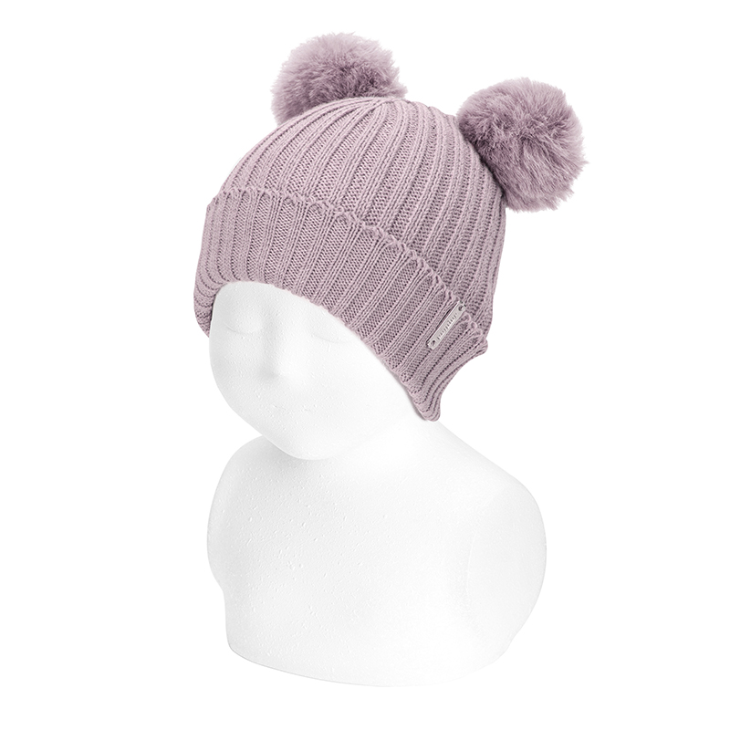 Gorra de nadó amb canalé i dues borles de pèl sintètic.