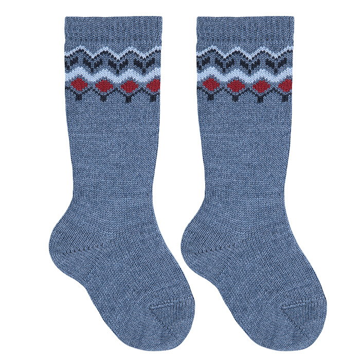 Mitjons alts en mescla llana merino amb cenefa de colors a contrast. Talles de 0 a 4 anys.
