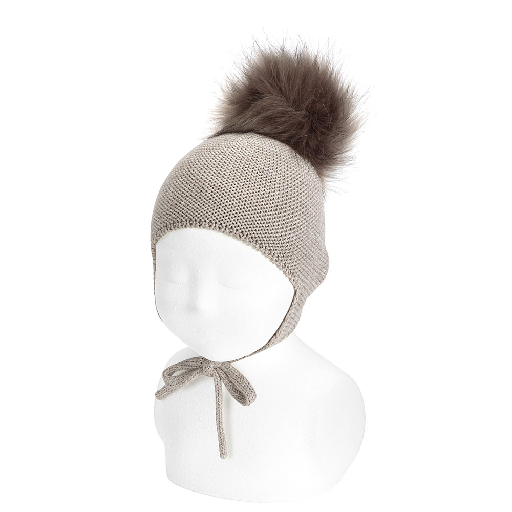 Merino wool blend knit hat with faux fur pompom. Very warm. With earflaps and knitted strap to tie under the chin.