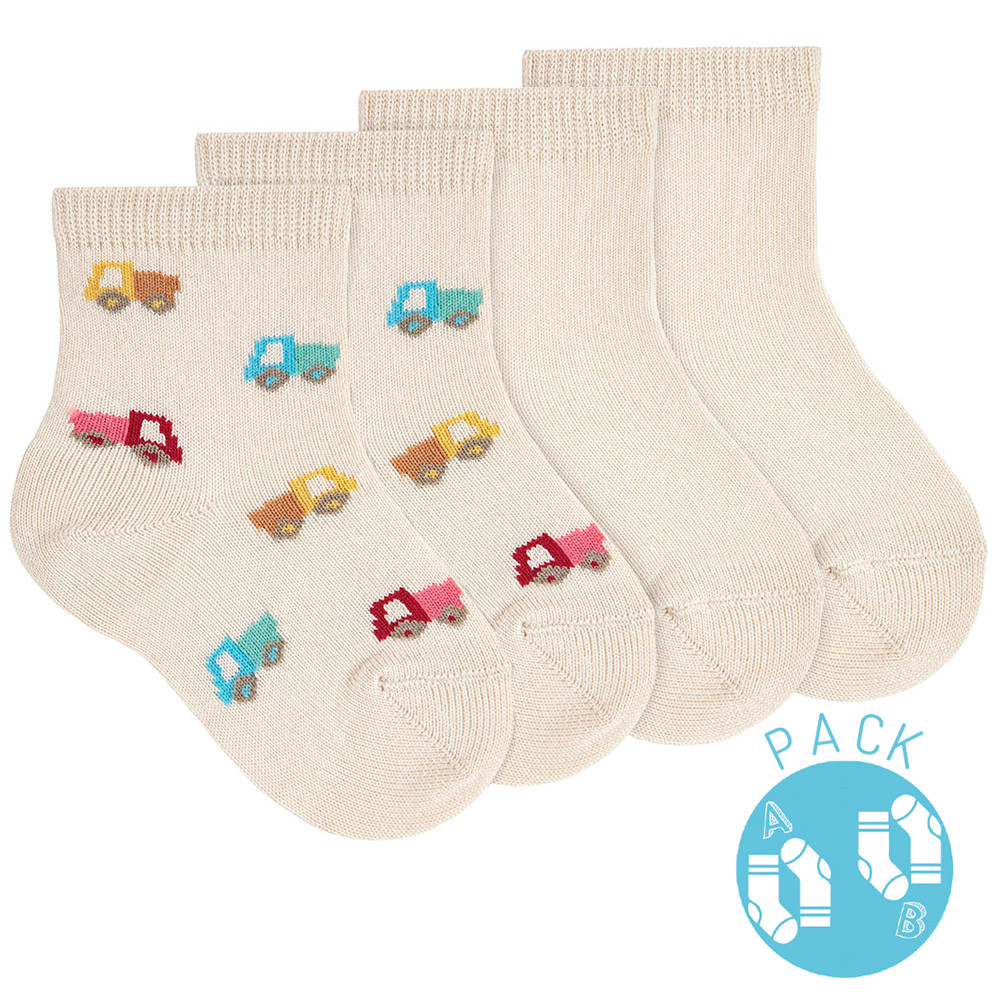 Pack of two pairs of socks: one pair of socks with truck designs and another pair of plain socks.