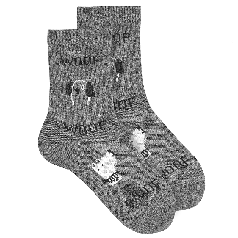 Short merino wool blend socks with a dog design. Children s sizes from 2 to 10 years.