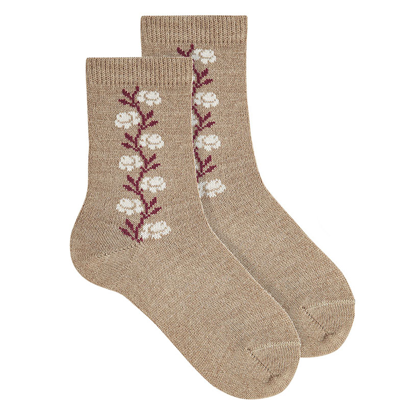 Short socks in a merino wool blend with an embroidered floral border. Children s sizes from 2 to 10 years.