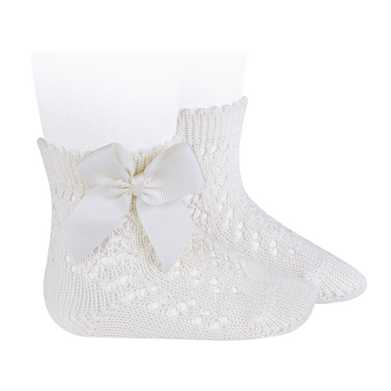 Perle cotton openwork tights for spring with bows in the side in a wide range of colours and sizes from 0-3 months to 8 years.
