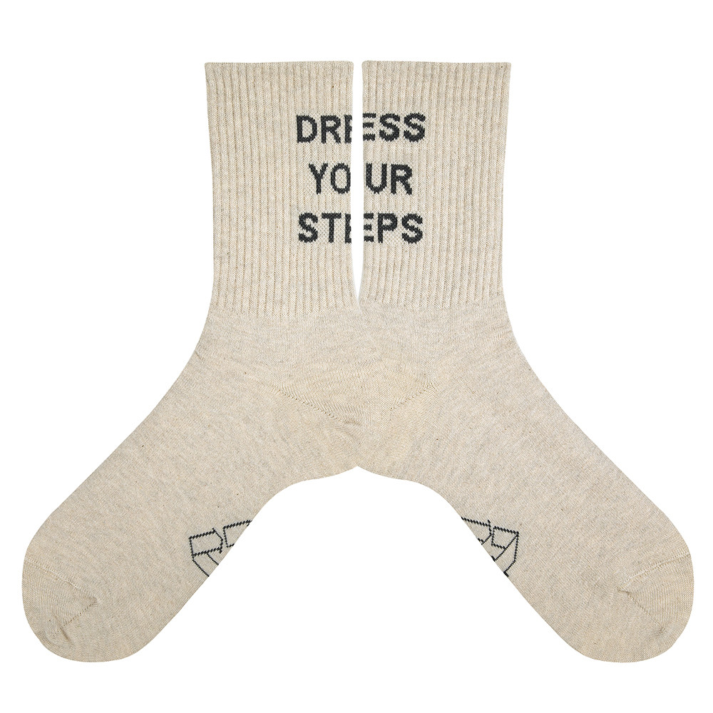 Women s ribbed socks in recycled cotton with Dress Your Steps text on the back.