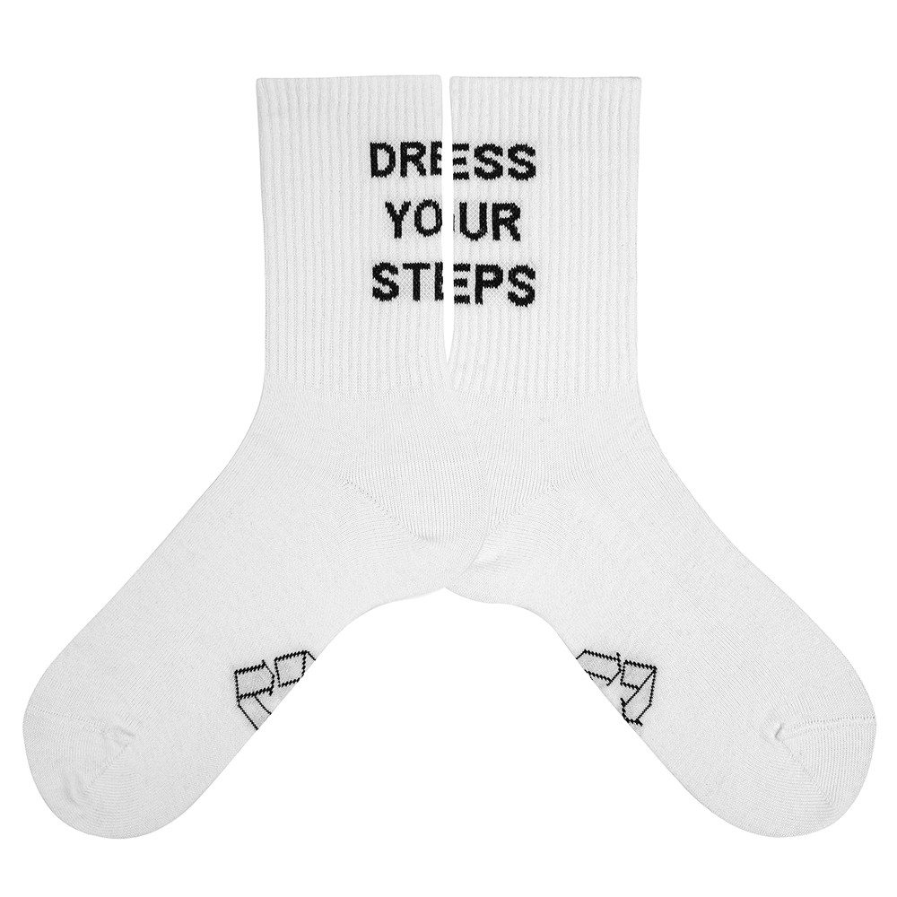 Women s ribbed socks in recycled cotton with Dress Your Steps text on the back.