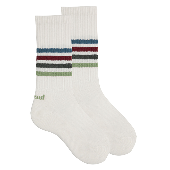 Four coloured stripes ribbed sport knee-high socks.