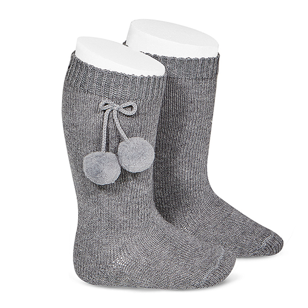 Calcetines altos de algodón cálido, largos por debajo de la rodilla y punto liso con borlas a tono. Disponibles en tallas de 000 (0-3 meses) a 8 años (32-35).