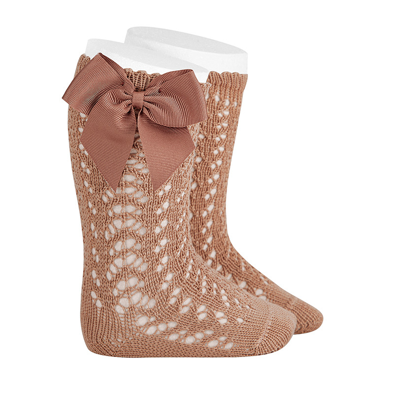 Calcetines altos calados 100% algodón perlé con lazo en el lateral. Disponible en tallas de 0-3 meses a 8 años.