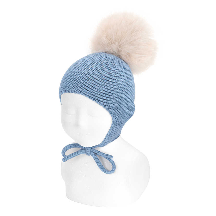 Gorro de punto para bebé de mezcla lana merino y borla de pelo sintética. Muy cálido. Con orejeras y tira de punto para anudar debajo el mentón.