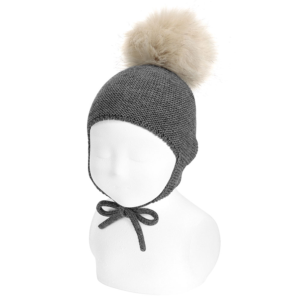 Gorro de punto para bebé de mezcla lana merino y borla de pelo sintética. Muy cálido. Con orejeras y tira de punto para anudar debajo el mentón.
