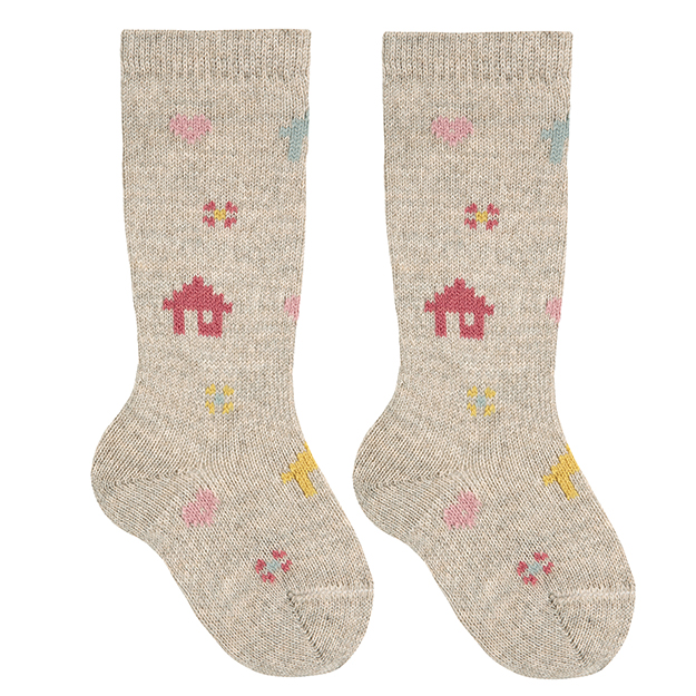 Calcetines altos de bebé en mezcla lana merino con dibujos de casitas de colores. Tallas de 0 a 4 años.