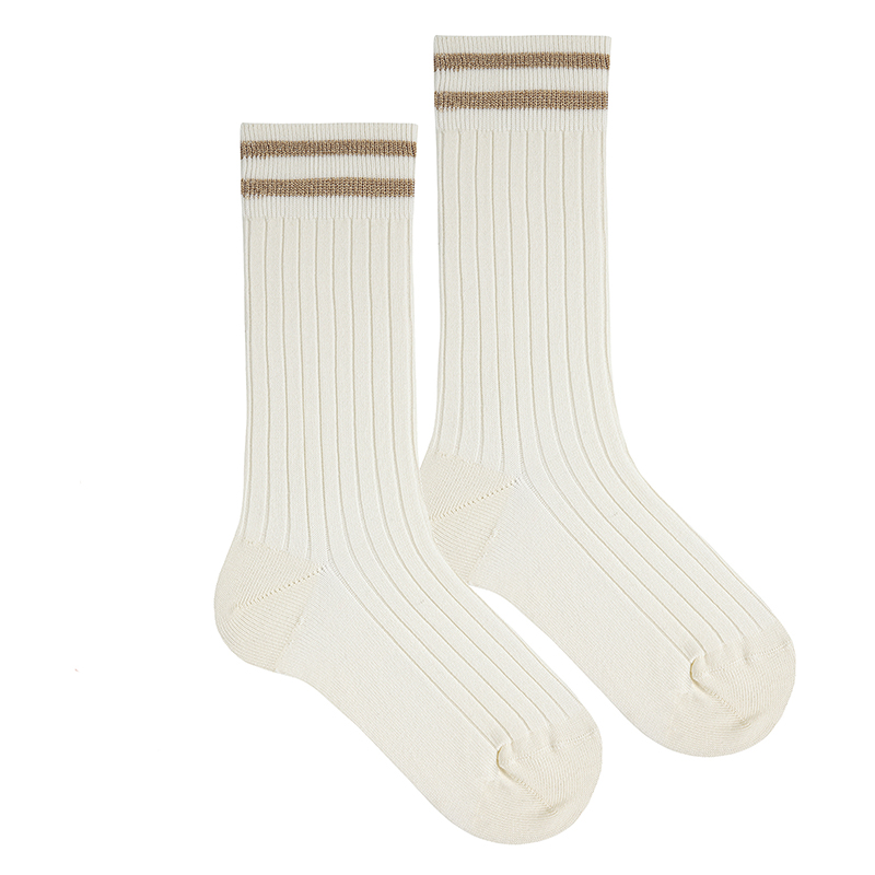 Calcetines altos de canalé para mujer con dos rayas de hilo brillante.