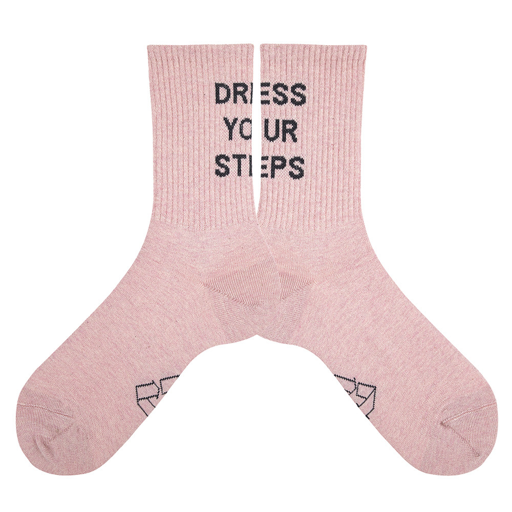 Calcetines para mujer de canalé en algodón reciclado con texto Dress Your Steps en la parte posterior.