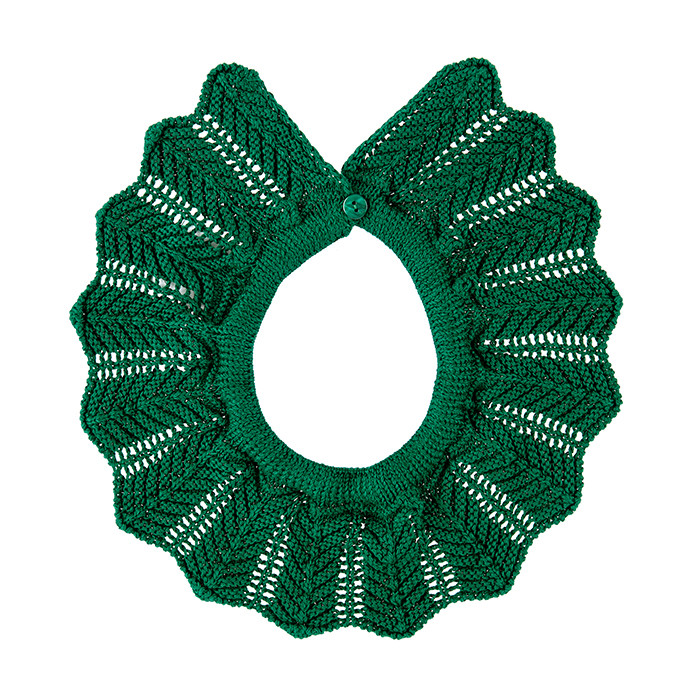 Col en tricot ajourée pour bébé. Fermeture par un bouton en bois.