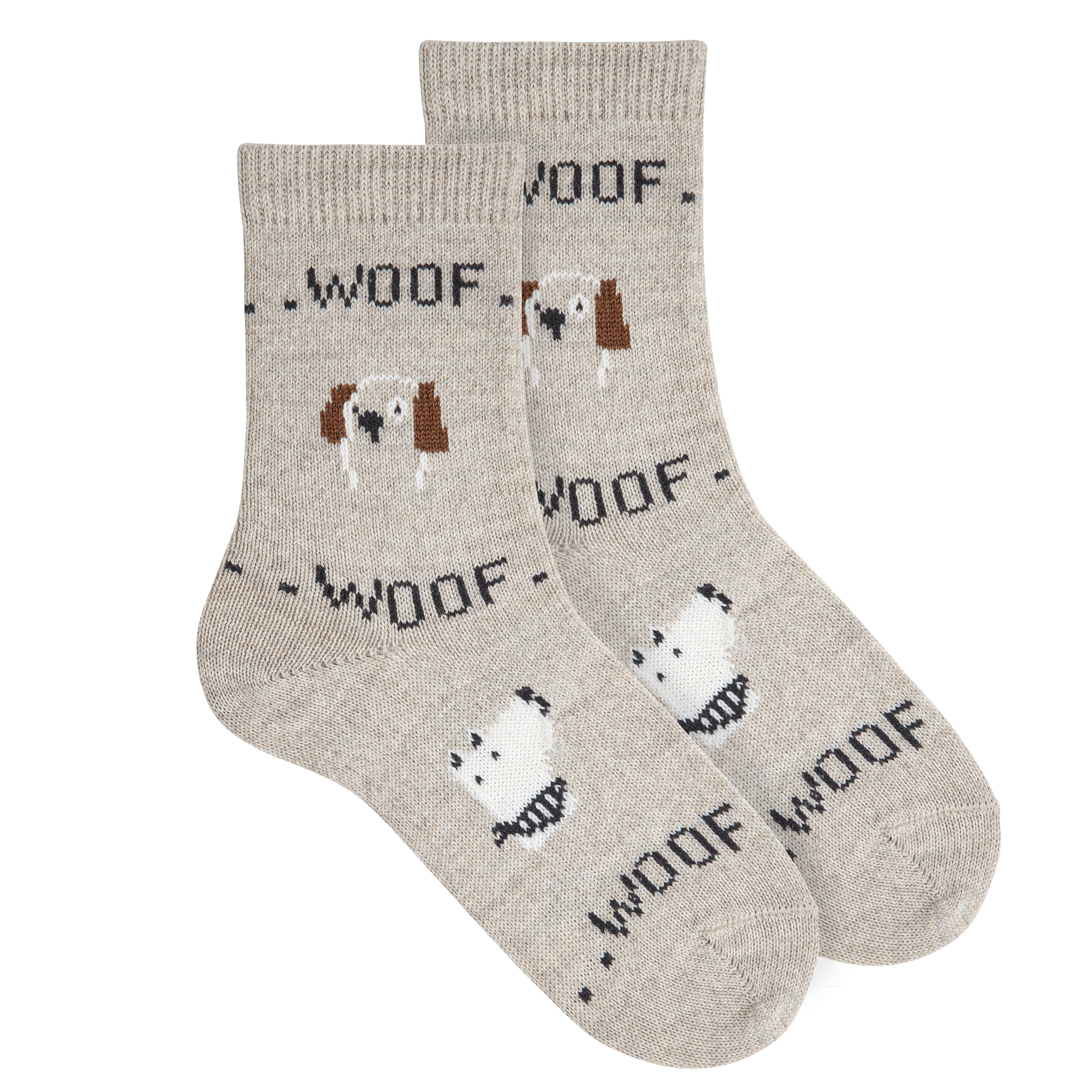 Chaussettes courtes en mélange de laine mérinos avec motif chien. Tailles enfants de 2 à 10 ans.