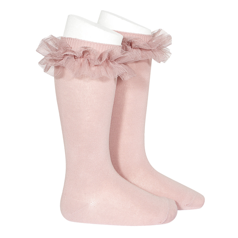 Chaussettes hautes en coton unies avec tulle plissé pour bébé et fille de 3-6 mois à 10 ans.
