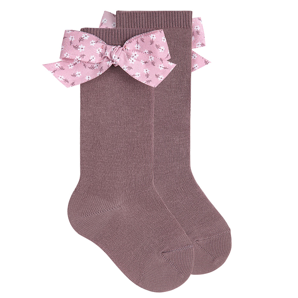 Chaussettes hautes unies avec noeud contrasté et imprimé fleurs Liberty. Taille de 6 mois à 4 ans.