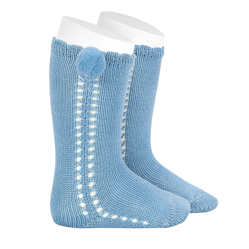 Chaussettes hautes 100% coton perlé pour printemps avec pompoms au cote. Disponible pour bébé de 0-3 mois à 4 ans.