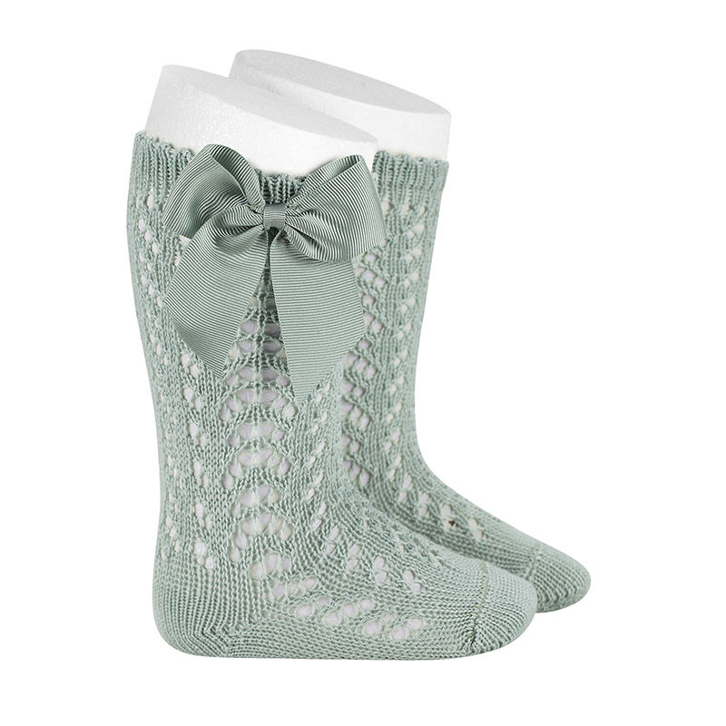 Chaussettes hautes 100% coton perle ajourées avec noeud. Disponibles en tailles pour bébé de 0-3 mois à enfant 8 ans.