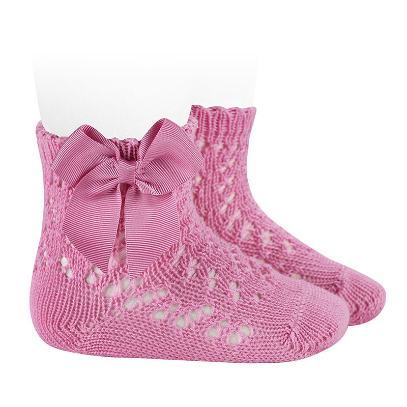 Chaussettes courtes en coton perle ajourée avec noeud. 80% coton 20% polyamide taille 000 (0-3 mois) et 00 (3-6 mois). 100% coton à partir de la taille 0 (6-12 mois) à 6 ans.