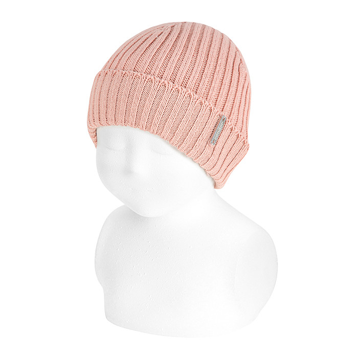 Bonnet côtelé pour bébé de 0 à 24 mois. À assortir au pull, à la culotte et à la barboteuse côtelée. 100% Coton.
