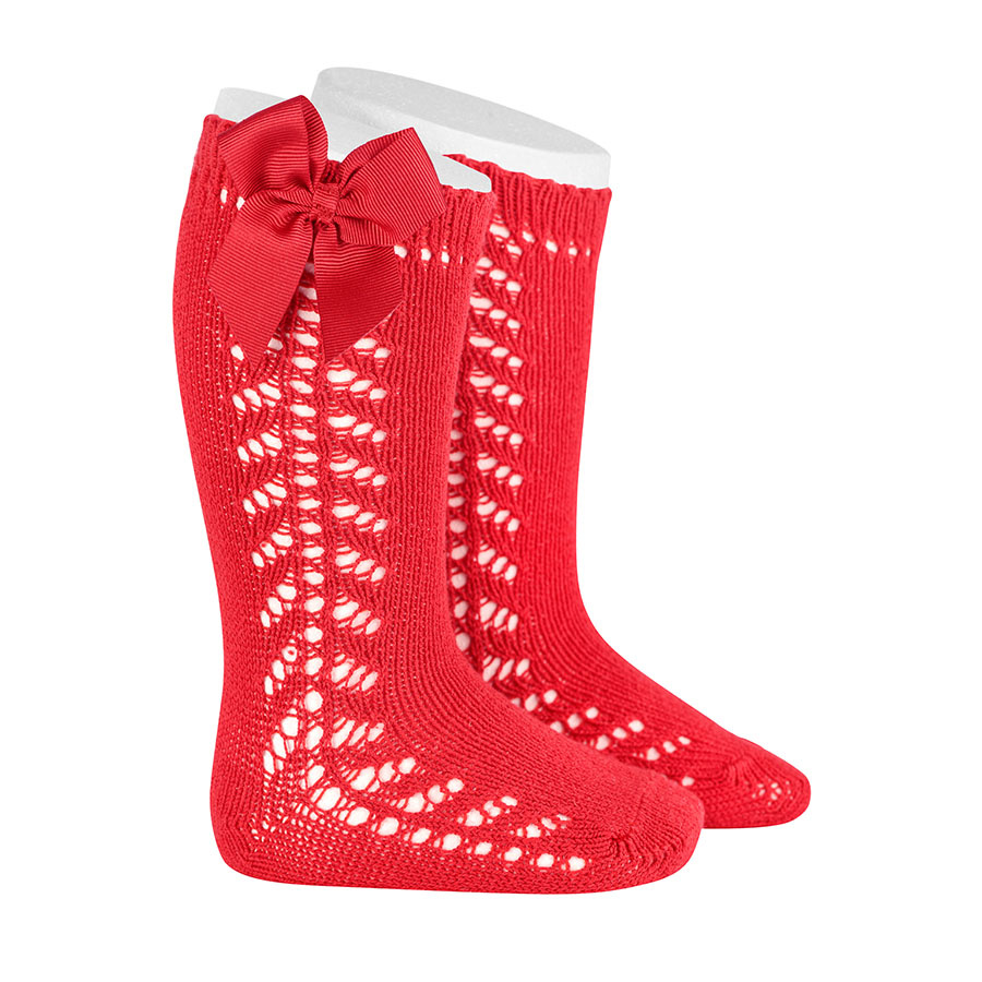 Chaussettes hautes en coton chaud avec ajourée latéral et noeud en gross-grain. Tailles de 0 a 6 ans.