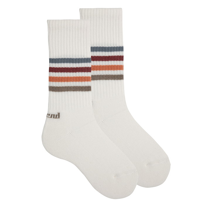 Chaussettes hautes poignet americain côtelée avec rayures en cuatre couleurs.
