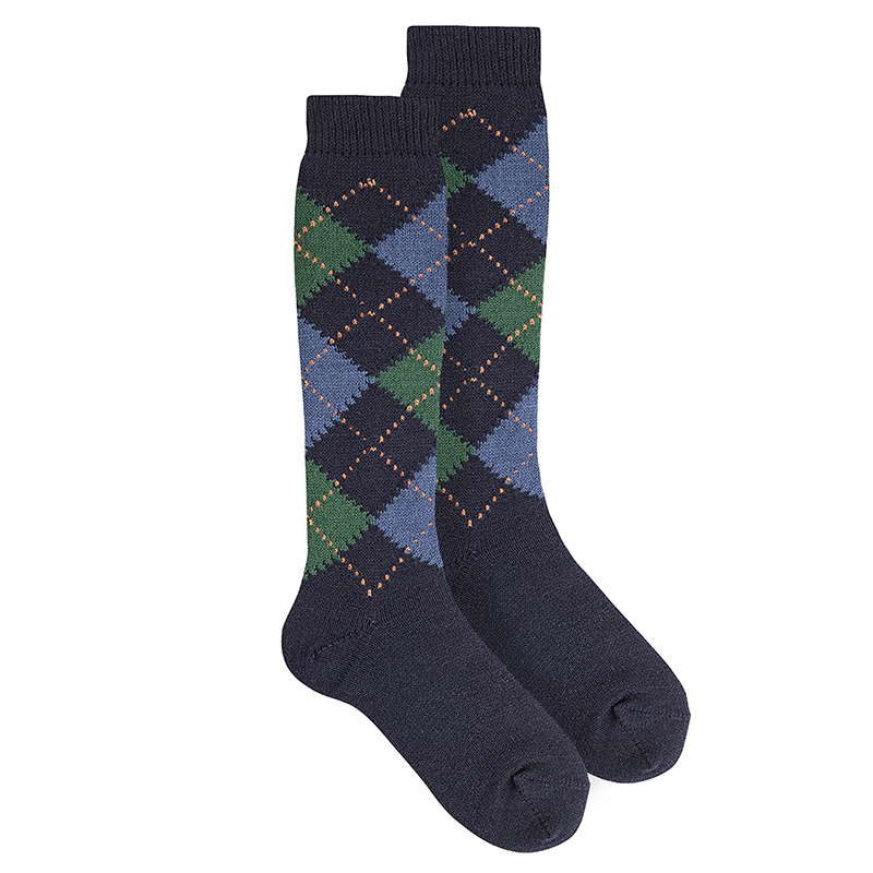 Calzini alti in acrilico con classici intarsi a rombi in colori fantasia per le taglie dalla 0 (6-12 mesi) alla 10 anni (36-39).