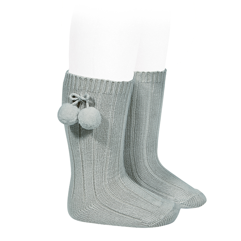 Calze lunghe in cotone caldo a coste con pompon. Disponibili da 0-3 mesi a 8 anni.