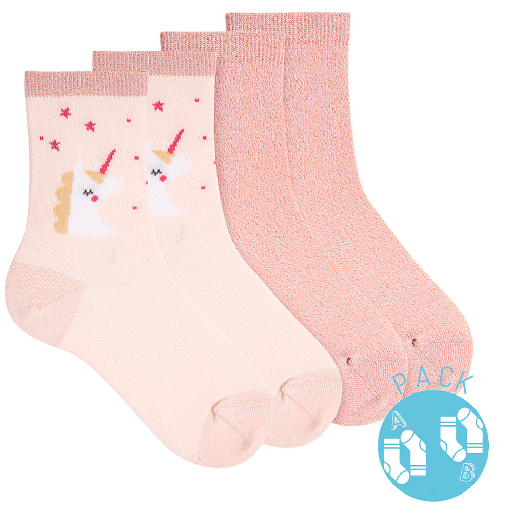 Confezione da due paia di calzini: un paio di calzini con un disegno di unicorno e un altro paio di calzini semplici realizzati in filato lucido.