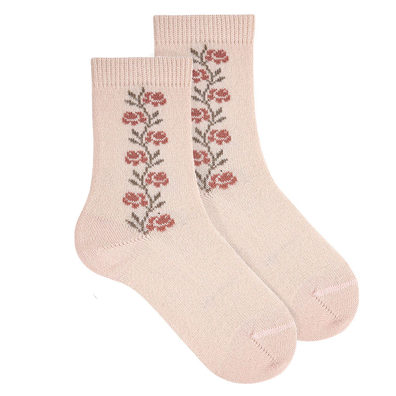 Calzini corti in misto lana merino con bordo floreale ricamato. Taglie per bambini dai 2 ai 10 anni.