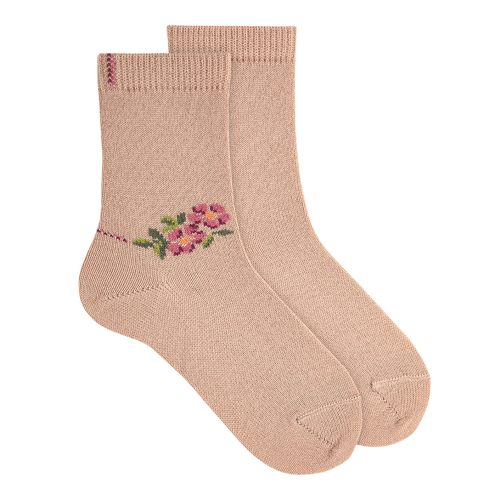 Calzini corti in misto lana merino con fiore ricamato. Taglie per bambini dai 2 ai 10 anni.