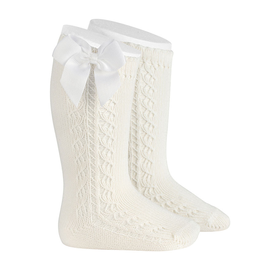 Calze lunghe da cotone caldo con traforato e fiocco. Taglie da 0 a 6 anni.