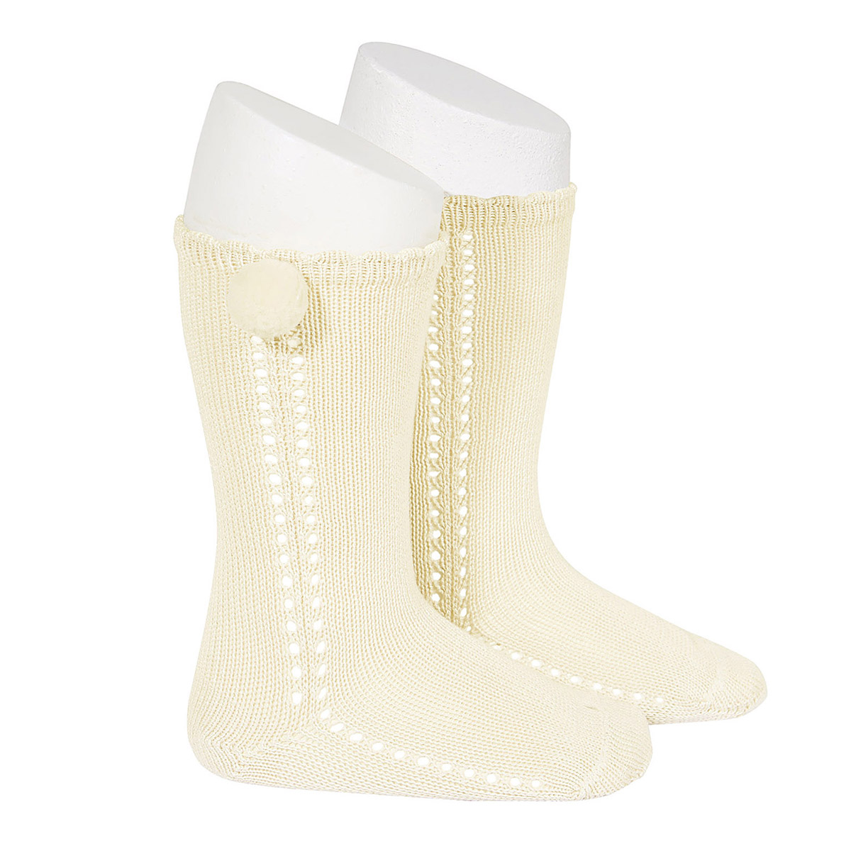 Calze lunghe in cotone traforato sul lato e pompon. Disponibili da 3-6 mesi a 6 anni.