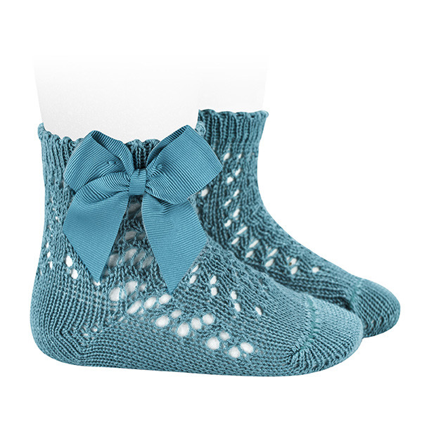 Calze corte in cotone 100% con fiocco gros-grain sul lato. 80% cotone 20% poliammida taglie 000 (0-3 mesi) - 00 (3-6 mesi). 100% cotone da taglia 0 (6-12 mesi) a 6 anni.