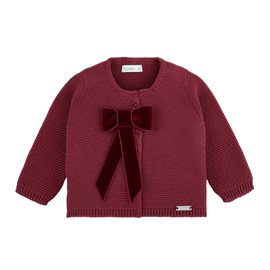 Giacca in maglia a coste con fiocco in velluto Coquette sul petto.