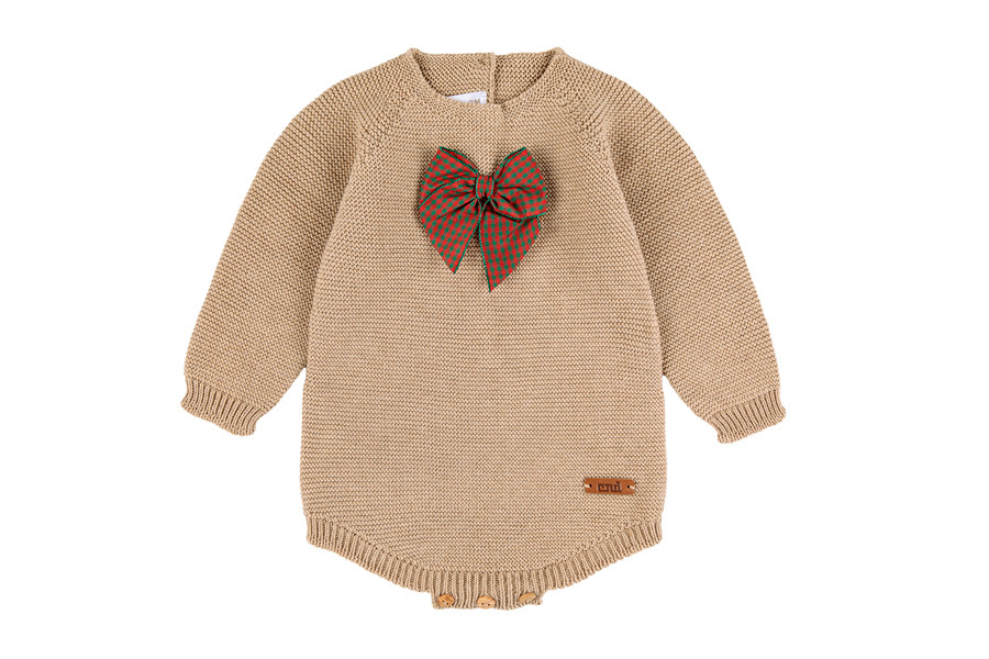 Tutina in maglia a coste con bottoni sul fondo e fiocco natalizio a quadretti sul petto.