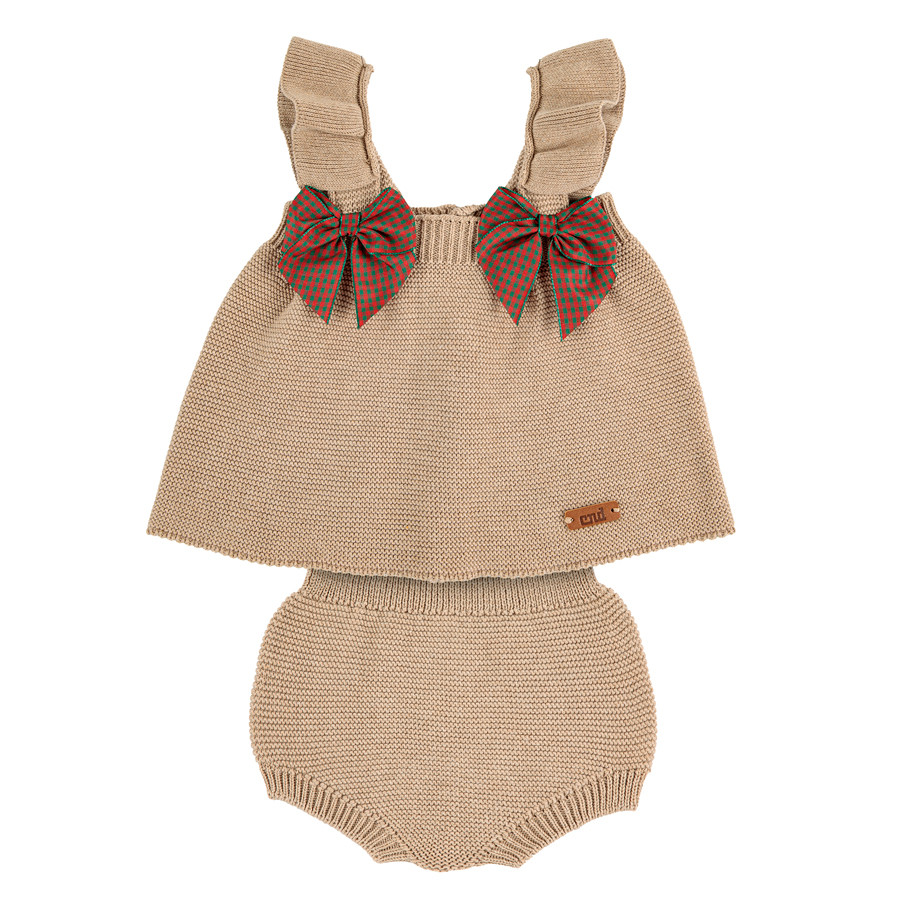 Completo pantaloncino-pantaloni in maglia e top in maglia con spalline arricciate e due fiocchi natalizi a quadretti vichy.