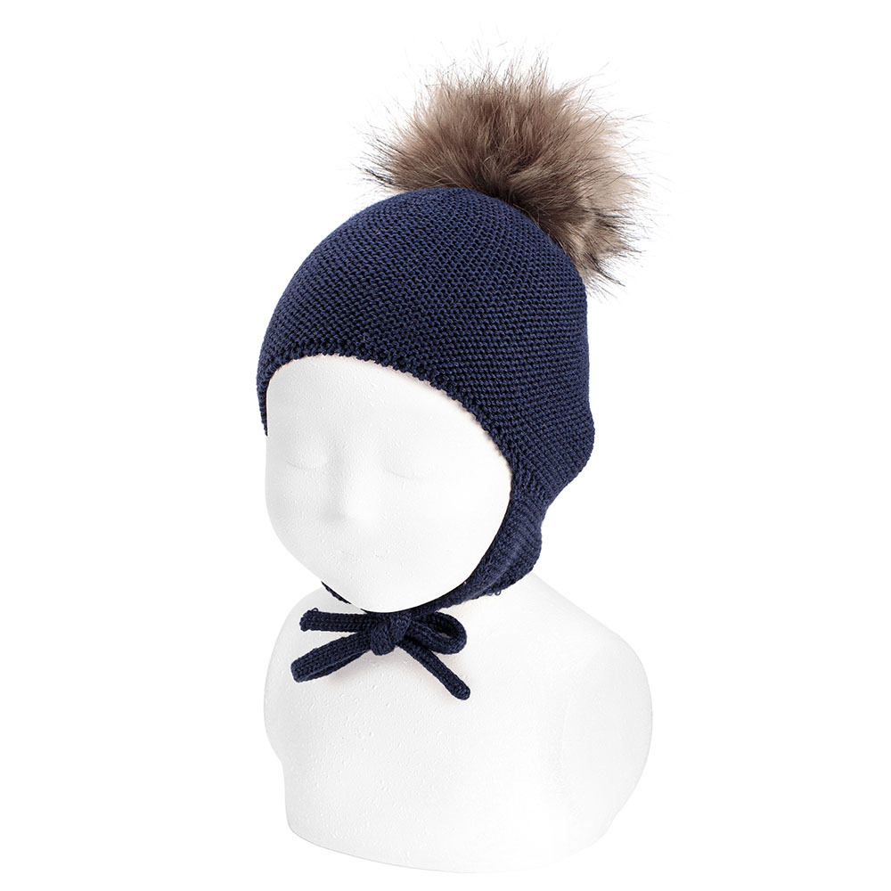 Cappello da neonato in maglia di misto lana merinos e pompon. Molto caldo. Con paraorecchie e cinturino in maglia da annodare sotto il mento.