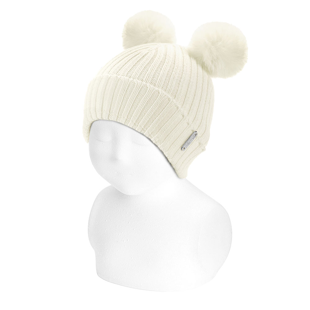 Berretto bebè a coste con due pompon a pelliccia sintetica.