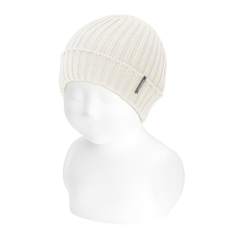 Cappello a coste per neonati da 0 a 24 mesi. Da abbinare al maglione, culotte e pagliaccetto a coste. 100% cotone.
