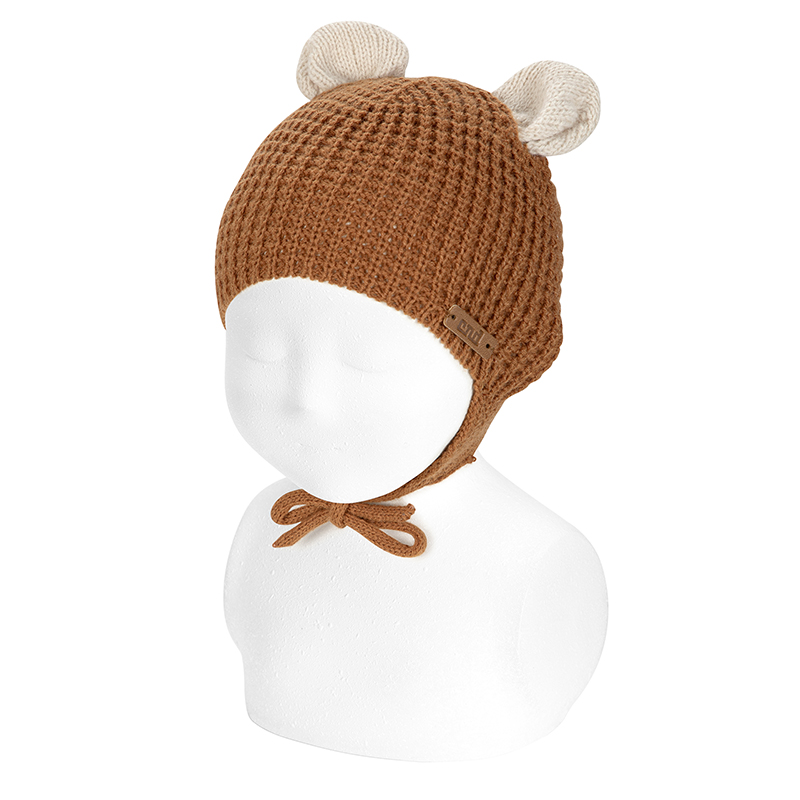 Beretto da bimbi maglia con rilievo e orecchiette marroni.