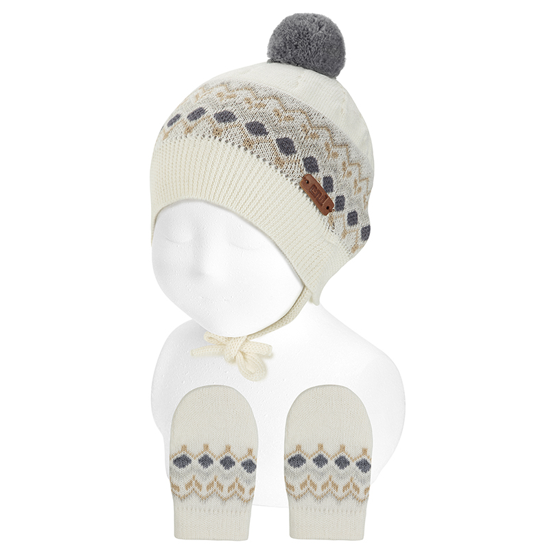 Completo ai ferri in misto lana merino con bordo. Set cappello e guanti.