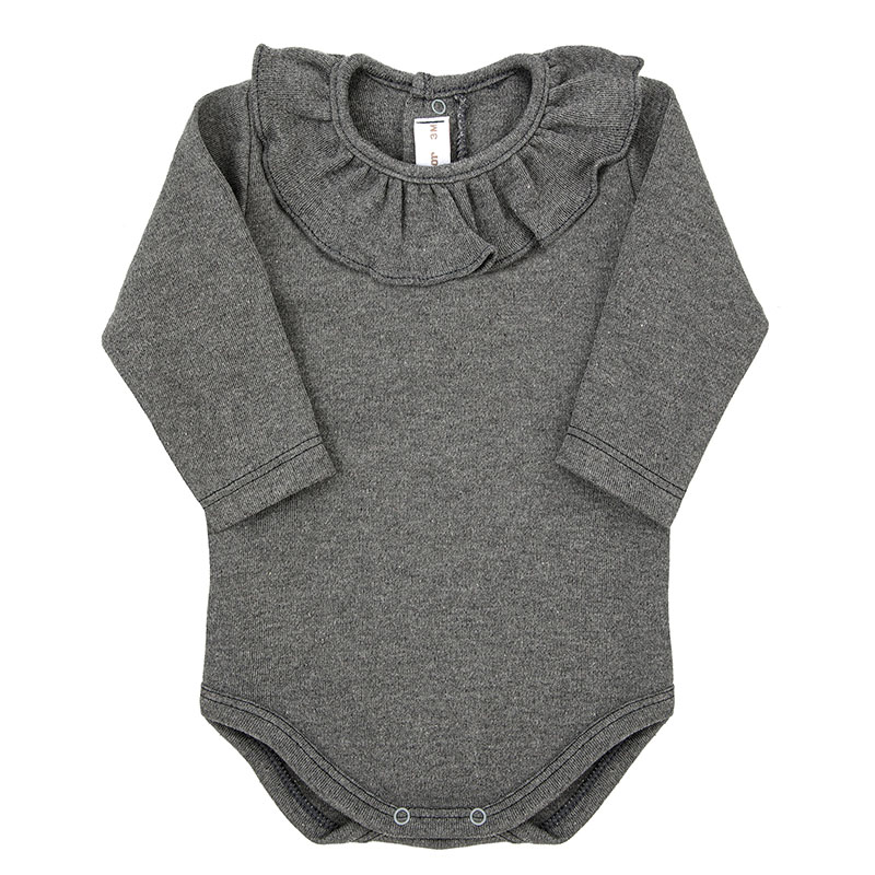 Body para bebé100% allgodón con gran volante en el cuello. Manga larga. Abrochado a la espalda con corchetes. Para bebé de 3 meses a 36 meses.