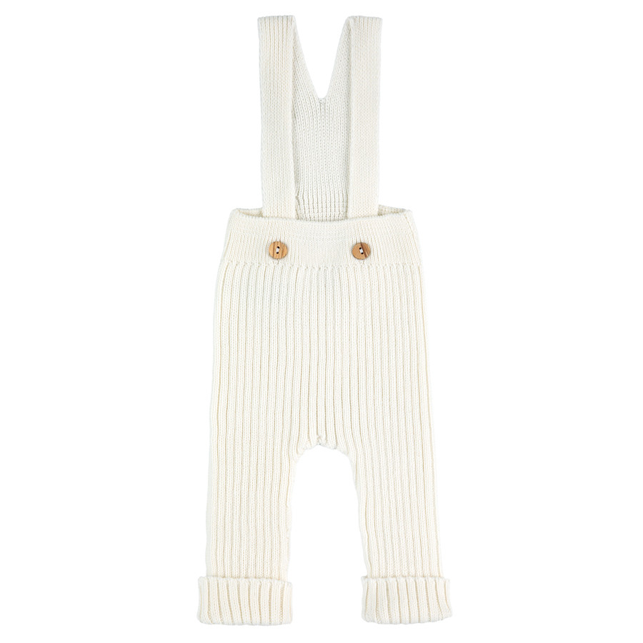 Pantalones de punto en canalé 100% algodón para bebé. Con tiraantes abrochados con botones de madera en la parte forntal.