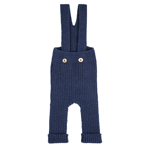 Pantalones de punto para bebé en canalé mezcla lana merino con tirantes abrochados con botones de madera.