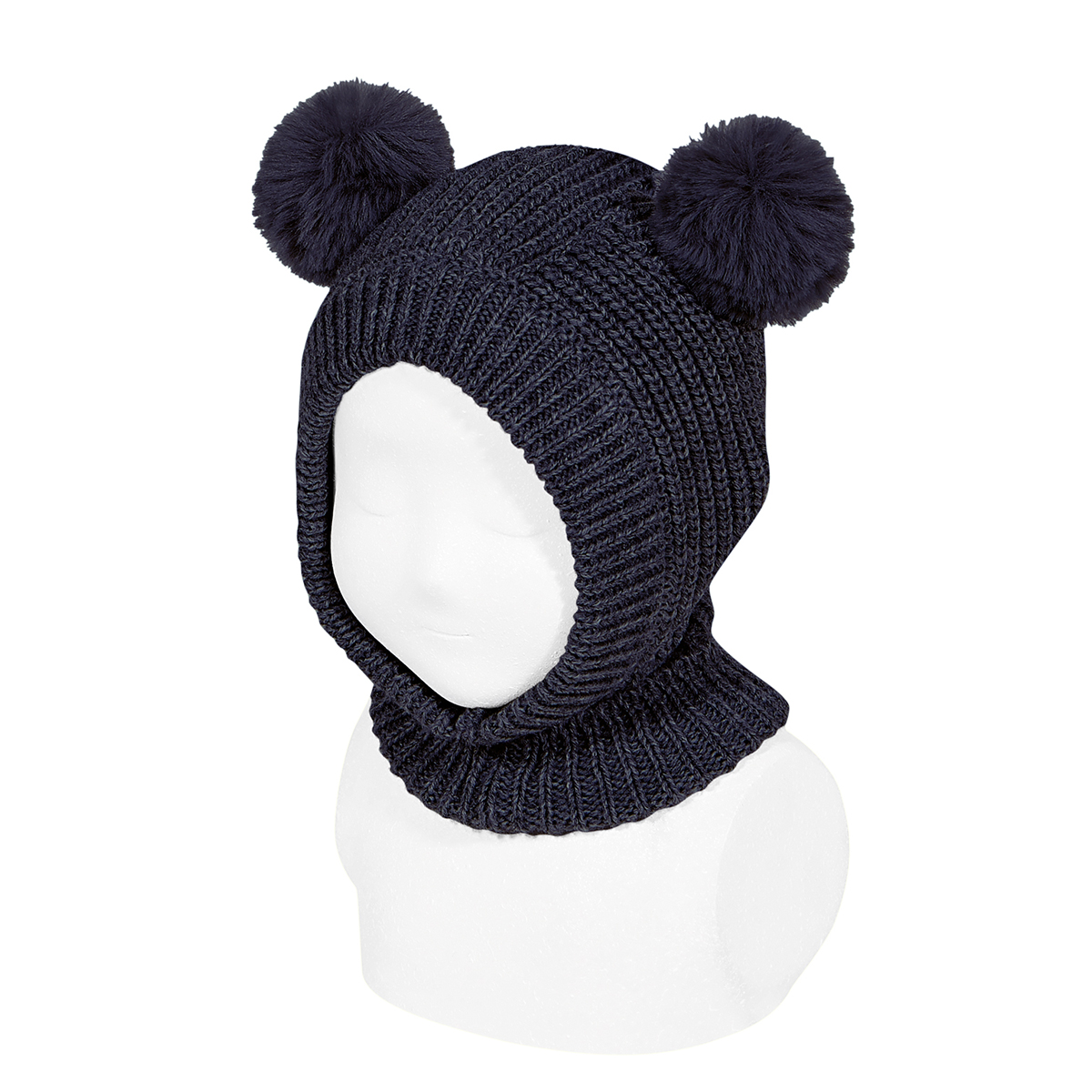 Pasamontañas infantil de punto inglés con dos borlas de pelo.